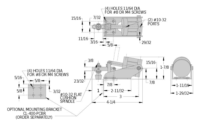 Super-compact air clamp for applications where space is at a premium. Similar to a wide-opening vertical-handle toggle clamp, except operated by an air cylinder instead of by hand. Toggle linkage provides high holding capacity and insures positive mechanical locking even if air pressure fails. Clamping arm opens 100°. Slotted open arm provides adjustable spindle location. 100 lbs holding capacity. This clamp is operated by a 3/4″-bore double-acting air cylinder, with Buna-N seals for -20° to +200°F operating temperature. Two #10-32 ports. 100-psi maximum input air pressure exerts 100 lbs maximum clamping force at center of arm.