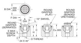 Rest pad with a built-in swivel ball to hold a Round Gripper. This swivel ball, held by a retaining ring, is removable to allow installing any of the nine different Round Gripper types (order separately below). Gripper Swivel Pads include a screw for fastening the gripper. This screw also serves as a positive stop to prevent the ball from swiveling too far. Gripper Swivel Pads can be surface mounted or installed in a counterbored hole. Available in body diameters from 5/8 to 1-1/2″ (17 to 36mm in metric). For smaller sizes, see Gripper Swivel Pads (Mini). Made in USA.