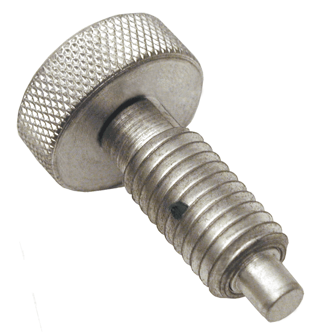 Spring-loaded plunger that locks in retracted position. To lock, pull knurled knob back and turn 90°. Slight taper on plunger tip for easy alignment. Available in thread sizes from #10-32 to 5/8-11 (M6 to M16 in metric), in steel or stainless steel. Made in USA.