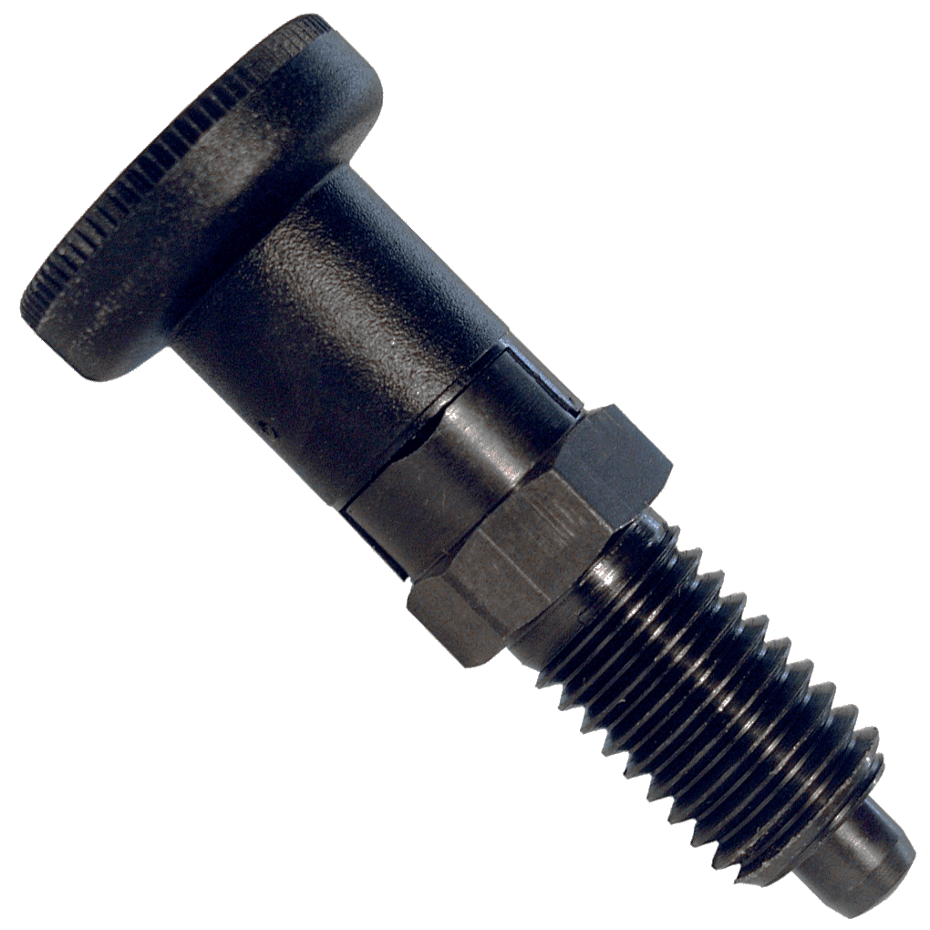 Precision indexing plunger with a attractive knob handle for convenient retraction. Threaded-body version allows adjustment and can be secured with an optional Jam Nut. Provides high strength and durability in an extremely compact assembly. Hardened and ground plunger. Tip has a slight taper for easy alignment. Available in thread sizes 3/8-24, 1/2-13, and 5/8-11. The locking type shown here has a spring-loaded plunger that locks in retracted position. To lock, pull the knurled knob back and turn 90°. Body is notched at 90° to keep the knob in its retracted position.