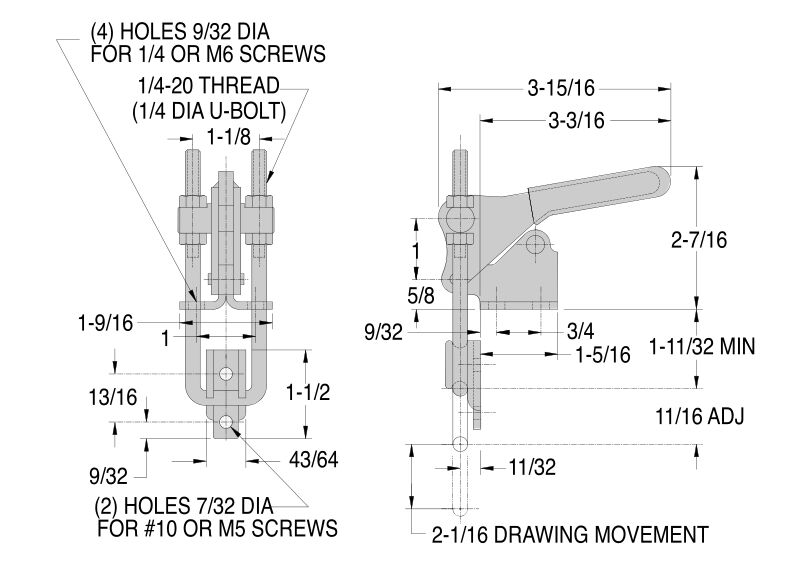 CL-210-PAVersatile latch clamp with a threaded U bolt for adjustability. Pulling direction is perpendicular to the base. Large, comfortable handle grip. 2-1/16″ drawing movement. Threaded U bolt allows an 11/16″ adjustment range. Available in in steel or stainless steel. Supplied with matching latch plate. 1000 lbs holding capacity.