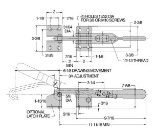 CL-350-PALatch clamp with a versatile hook for grasping a rod or rim. Clamp latches horizontally, vertically, or at any angle in between. 6-1/8″ drawing movement. Threaded hook allows an 3/4″ adjustment range. Order matching latch plate separately. 1000 lbs holding capacity.