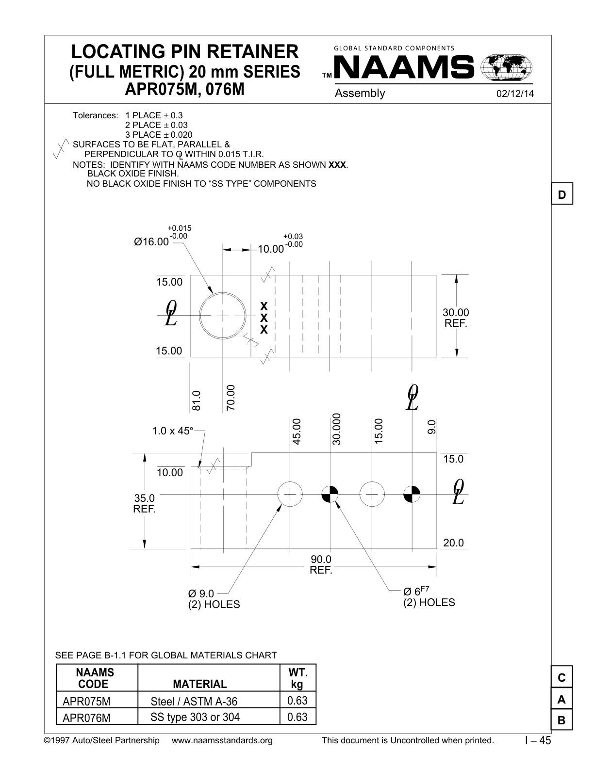 LOCATING PIN RETAINER (FULL METRIC) 20 mm SERIES APR075M, 076M