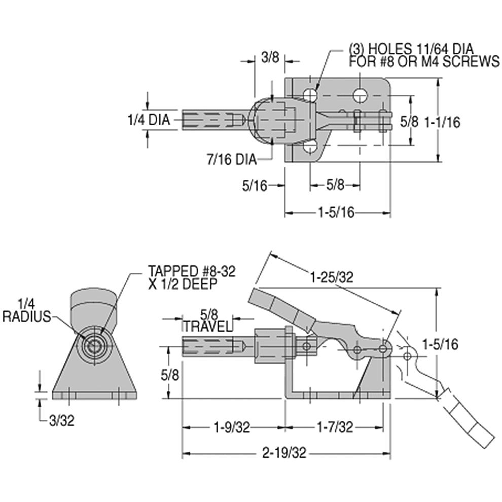 CL-50-SPCTapped Plunger Miniature plunger clamp, perfect for electronics fixturing and other light-duty applications. Locks in extended or retracted position. 5/8″ plunger travel. Choice of #8-32 tapped plunger (M4 in metric) or 1/4-20 externally threaded plunger. Available in in steel or stainless steel. 100 lbs holding capacity.