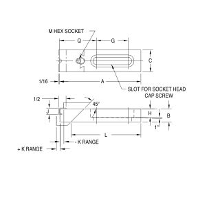 These low-profile clamps are ideal for securely gripping the side of a workpiece to keep the top clear for machining, especially when a large clamping range is required to accommodate workpiece-size variations. The serrated jaw slides at a 45° angle to exert clamping force both forward and downward simultaneously. Clamp by tightening the socket-head screw in the sliding jaw with a hex wrench. Choice of high-nose clamping jaw (shown here) or low-nose clamping jaw. V-groove in nose is useful for clamping round parts or corners.The adjustable (slotted) edge clamps shown here are useful for mounting directly on a machine table. The slot is tapered to prevent the clamp from backing off under heavy forces (use two mounting screws on longer clamps). Available in five clamp sizes with mounting-screw sizes from 5/16-18 to 3/4-10 (M8 to M20 in metric), each in a choice of slot lengths. Made in USA.