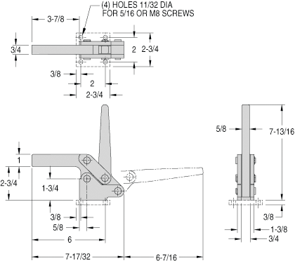 CL-61-HDC-211 Solid Arm, Straight BaseHeavy-duty toggle clamps with a machined steel handle and clamping arm. Simple, easy-opening toggle clamps with extra arm height. Arm opens 83° while handle moves 83° ° ideal when wide opening is not desirable. Hardened bushings at all pivot points. Solid arm can be tapped to accept a spindle, or otherwise modified. 5000 lbs holding capacity.